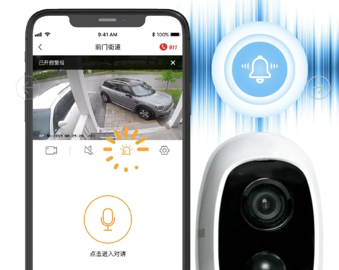 而当用户通过APP上的视频监控看到家附近有出现可疑活动出现时,可在App点击“开启警铃”,AIjia家庭智能安防摄像头就会发出高音的警告声,帮用户吓退不速之客,有效解除潜在危机。独居也不怕!